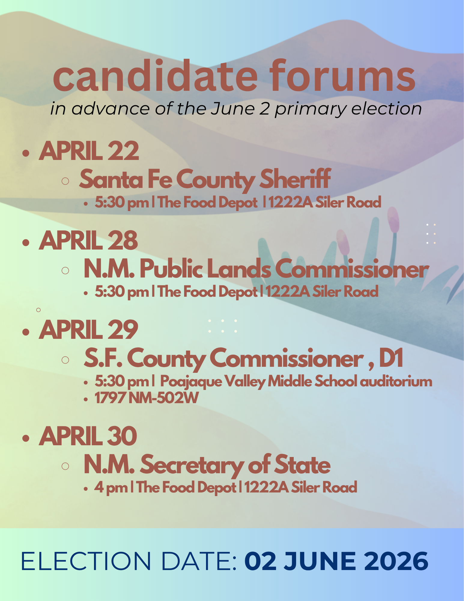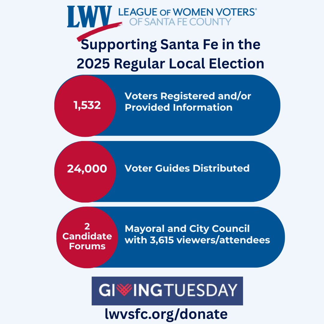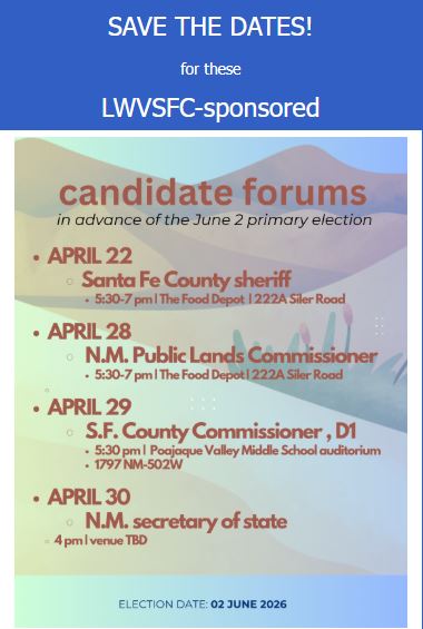 The League of Women Voters of Santa Fe County (LWVSFC) is a non-profit organization that seeks to promote informed citizen participation in government by providing unbiased information about political issues and candidates. The LWVSFC focuses on issues that affect Santa Fe County residents and are within the scope of elected and appointed officials in Santa Fe County. The LWVSFC does not support or oppose any political party or candidate. Rather, we are focused on providing information that will allow Santa Fe County residents to form their own opinions based on factual information. The LWVSFC does adopt positions on local issues following a process of study and consensus or concurrence, after which we advocate publicly based on those positions.