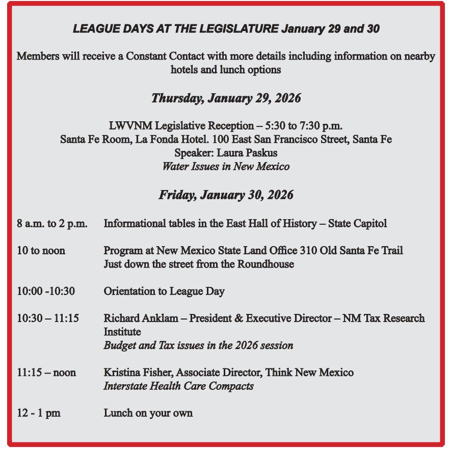 For more information on League Days at the 2026 NM Legislature and other activities the League is involved in in the upcoming 2026 Legislative Session, go to LWVNM.org