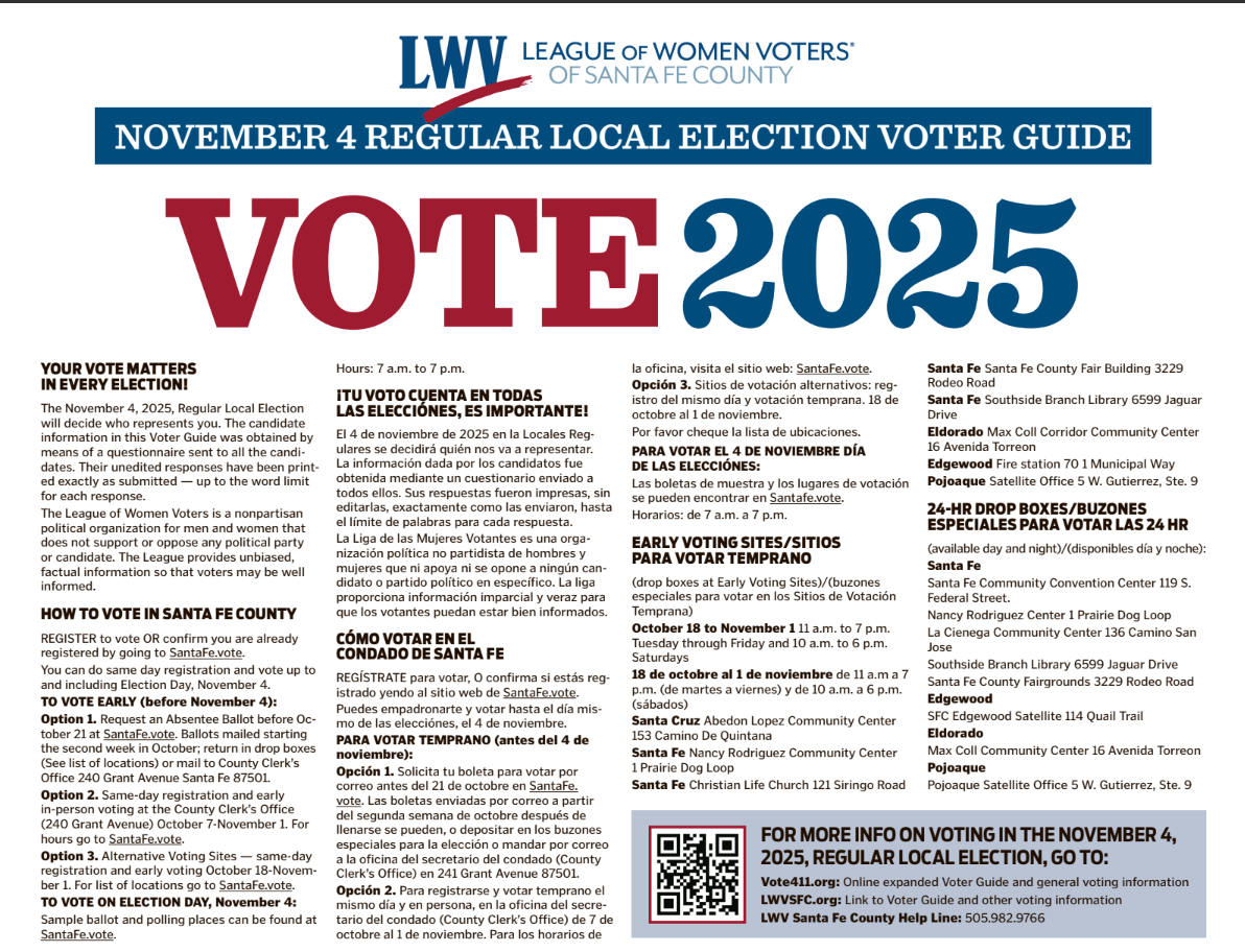 2025 Regular Local Election November 4 Click HERE to read the Santa Fe County Voter Guide For more details in English For more details in Spanish Bonds and Measures on the Ballot